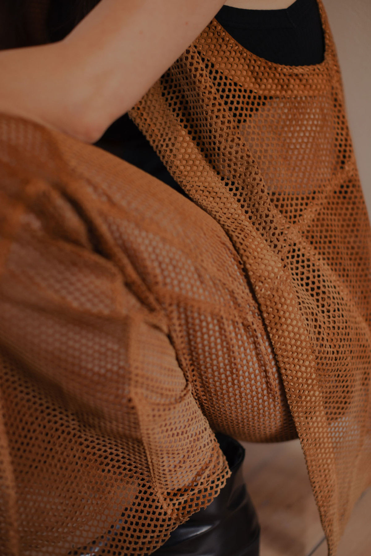 This perforated leather suit found second-hand in Trieste on my way to Venice night out, is a rare beauty. It's even more interesting when I'm not wearing it but looking at it. It comes as no surprise that architects love perforation, porousness, and layering. This piece of genuine leather seems old; I would say it's from the 70s. It looks very fragile but is surprisingly agile. I don't think there are many materials that can allow this cutting method of holes, as they are usually weaved and would branch out and still be comfortable to wear. Even though I'm a non-meat eater, using leftover pieces of leather of lower quality could be a sufficient way to work with leather industry residues and cutoffs. The layering creates an interesting effect by reading the overall silhouette and body inside the suit. This fit looks good both from afar and even better in detail.
